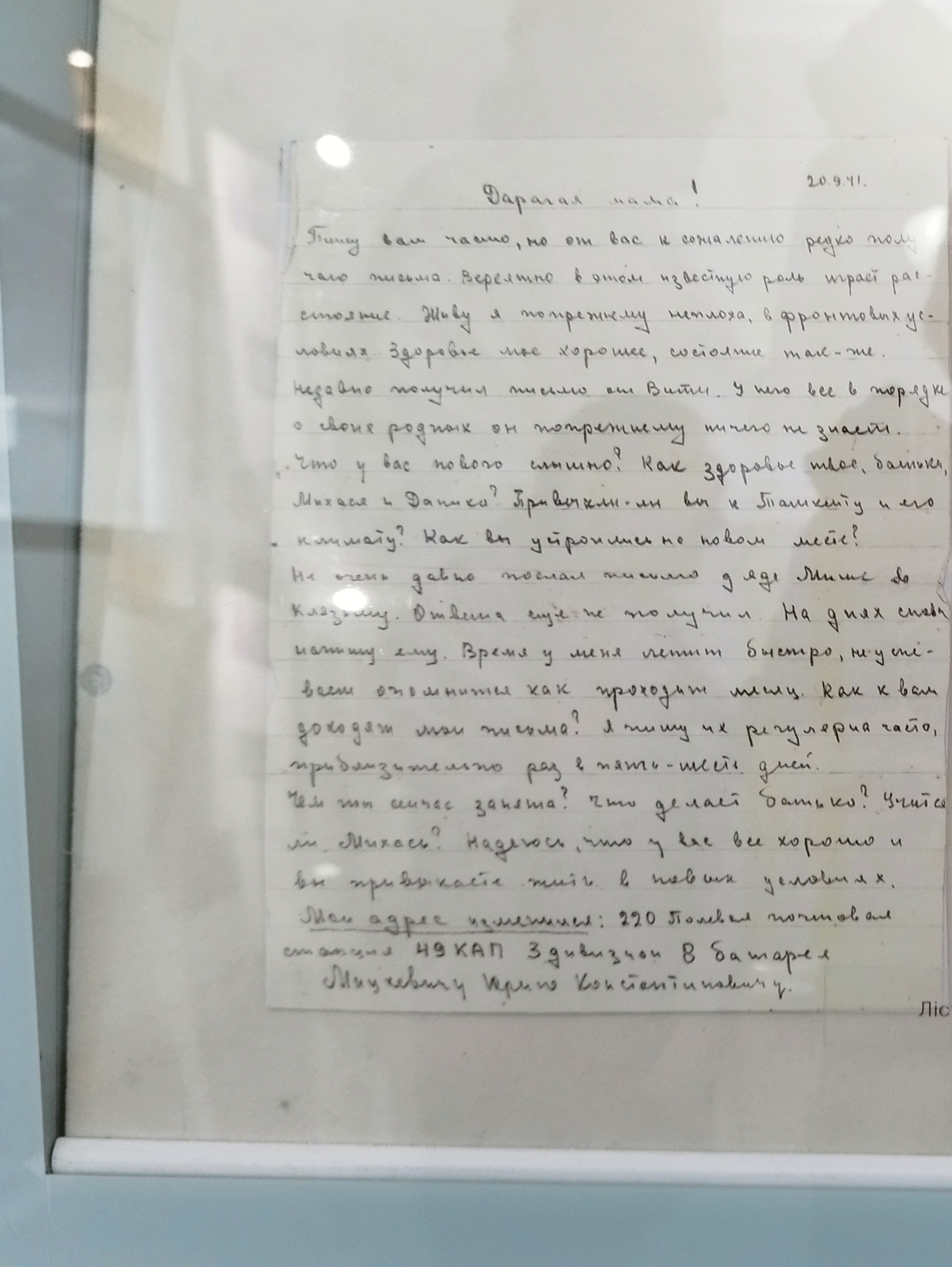 У фондах музея захоўваюцца адзін ліст Юркі дзядзьку Міхаілу Каменскаму, два — бацьку і два — маме. Але ўжо з канца верасня пісьмы яфрэйтару вярталіся з паметай “адрасат выбыў з часці”. З лістоў стала вядома, што Юрка ўдзельнічаў у абароне Смаленска, пасля іх з таварышамі полк стаяў на ўскраіне горада Ярцава.