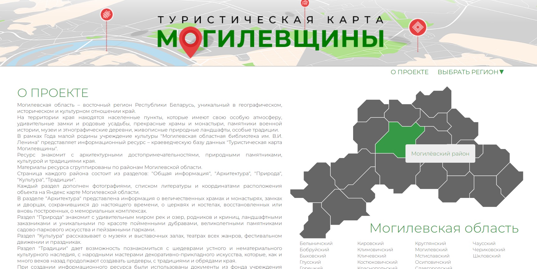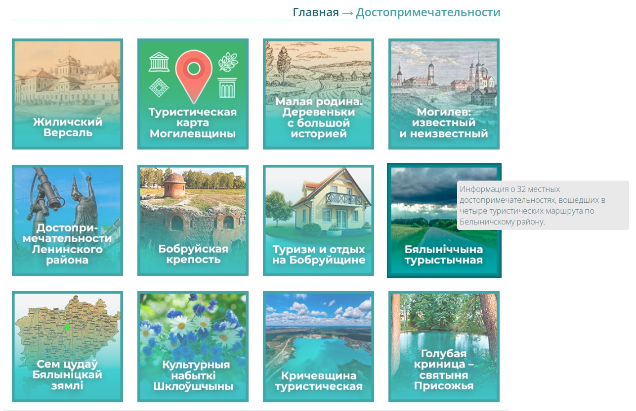 Інфармацыйны рэсурс "Турыстычная карта Магілёўшчыны" знаёміць з архітэктурнымі славутасцямі, прыроднымі помнікамі, культурай і традыцыямі кожнага рэгіёна вобласці. Матэрыялы згрупаваны па раёнах, а мясціны, здольныя зацікавіць і нават заінтрыгаваць, прадстаўлены ў пяці раздзелах, якія дапоўнены каардынатамі размяшчэння аб’екта на Яндэкс-карце Магілёўскай вобласці, фатаграфіямі і спісам літаратуры.