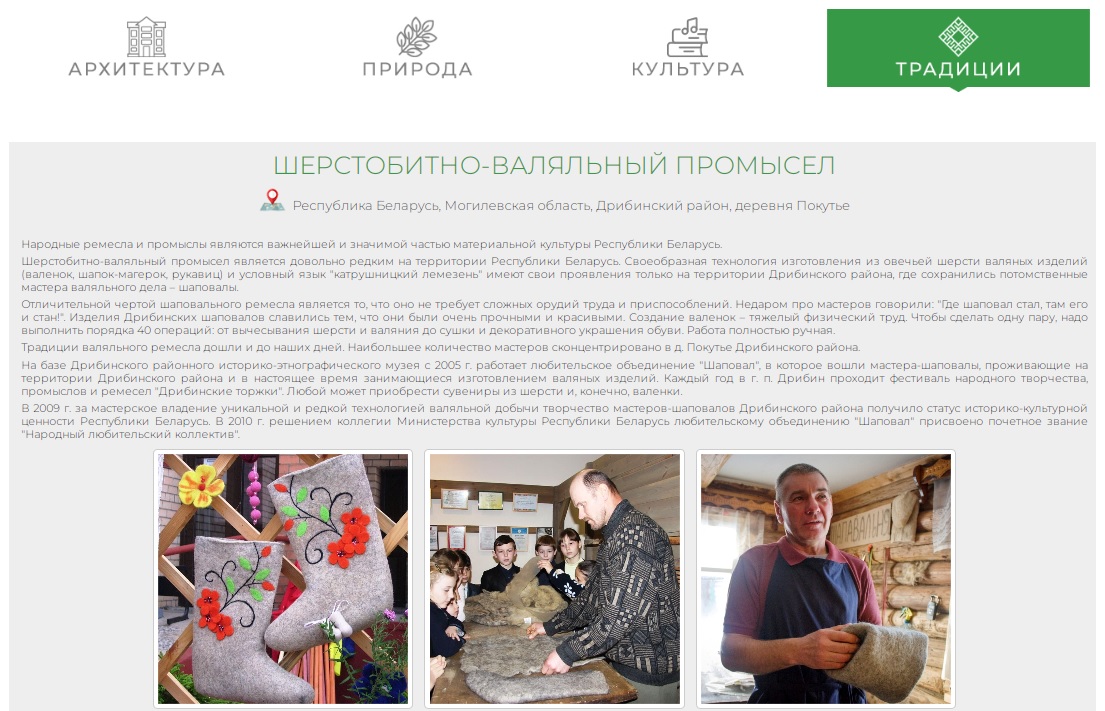 Традыцыі і абрады краю, шэдэўры вуснай і нематэрыяльнай культурнай спадчыны, народныя майстры дэкаратыўна-прыкладнога мастацтва, якія ствараюць унікальныя вырабы ручной работы, адлюстроўваюцца ў раздзеле "Традыцыі".