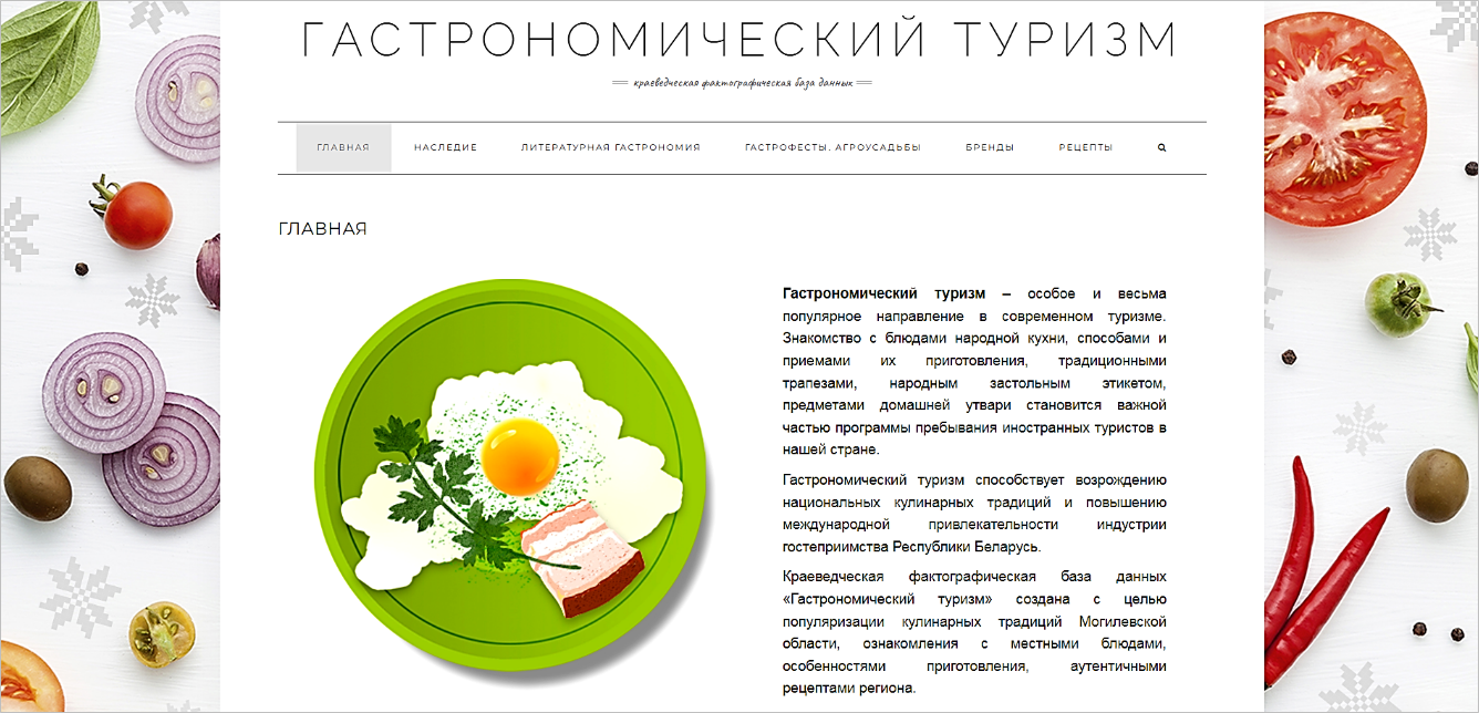 Кулінарныя традыцыі Магілёўскай вобласці прадстаўляе база даных "Гастранамічны турызм": яна ўключае інфармацыйны матэрыял, фотаздымкі, відэаматэрыялы, спісы літаратуры, якія знаёмяць з мясцовымі стравамі, асаблівасцямі іх прыгатавання, а таксама аўтэнтычнымі рэцэптамі, сабранымі ў старажылаў.
