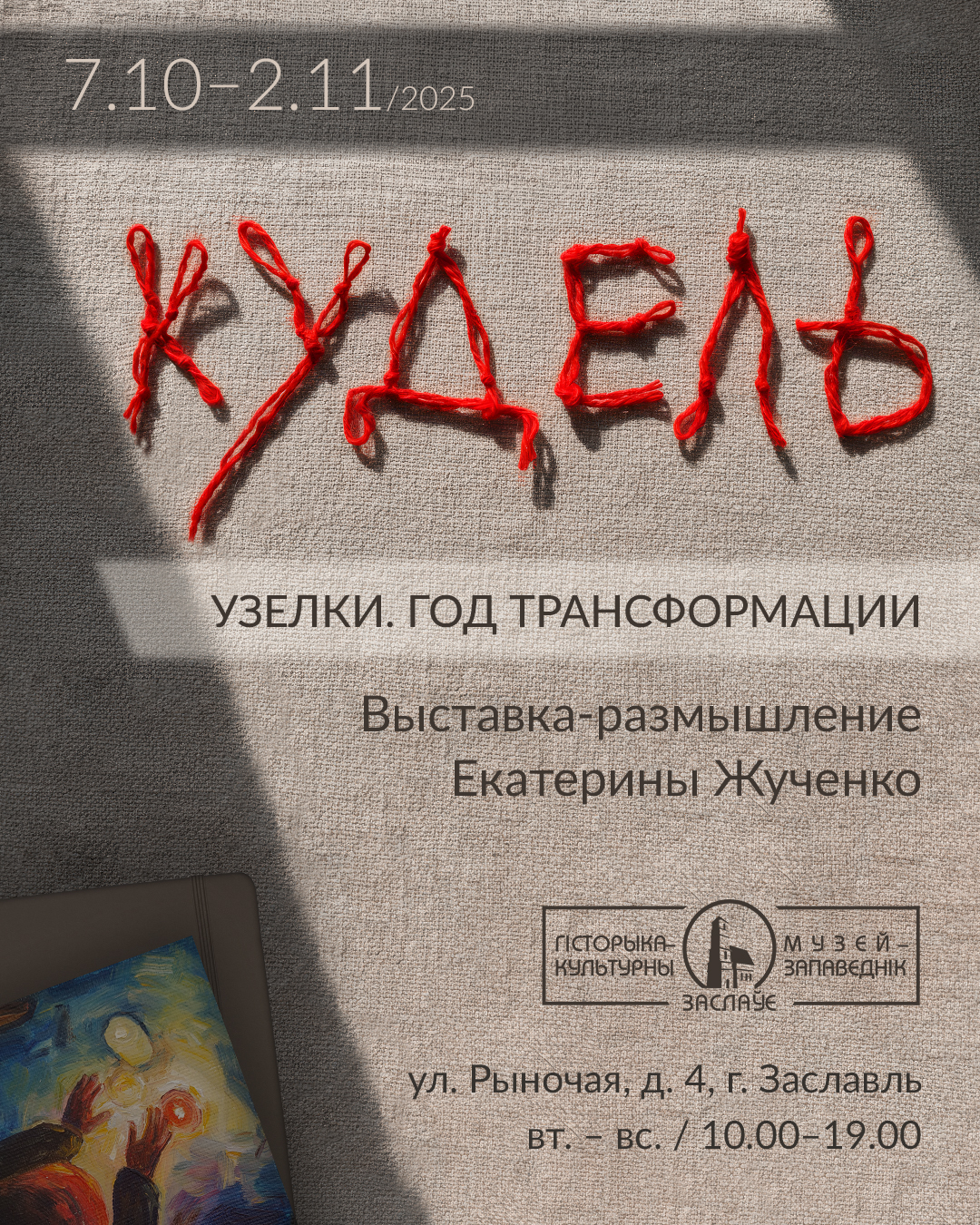 Часовая экспазіцыя — выстава Кацярыны Жучэнка “Кудзеля / Вузельчыкі. Год трансфармацыі” — пачне работу 7 кастрычніка ў музейна-выставачным комплексе Гісторыка-культурнага музея-запаведніка “Заслаўе”.