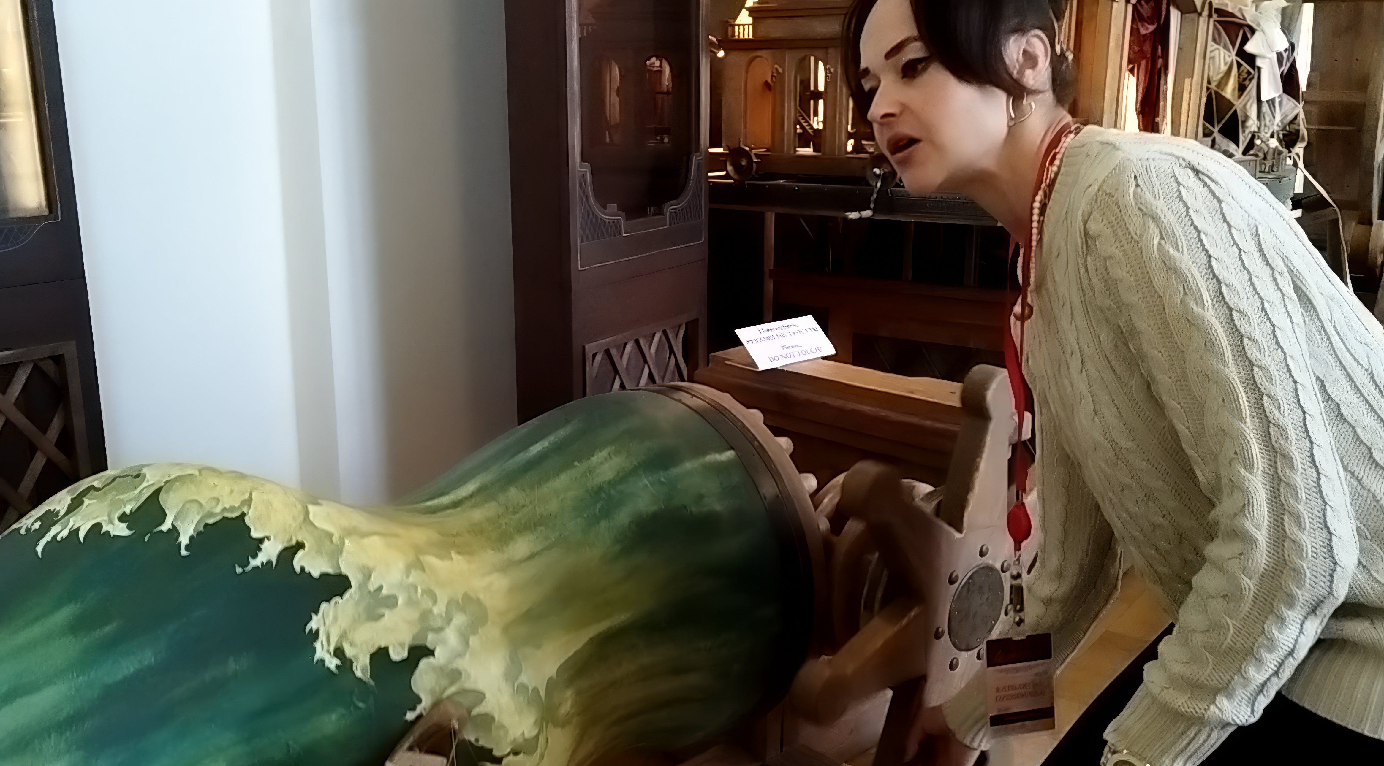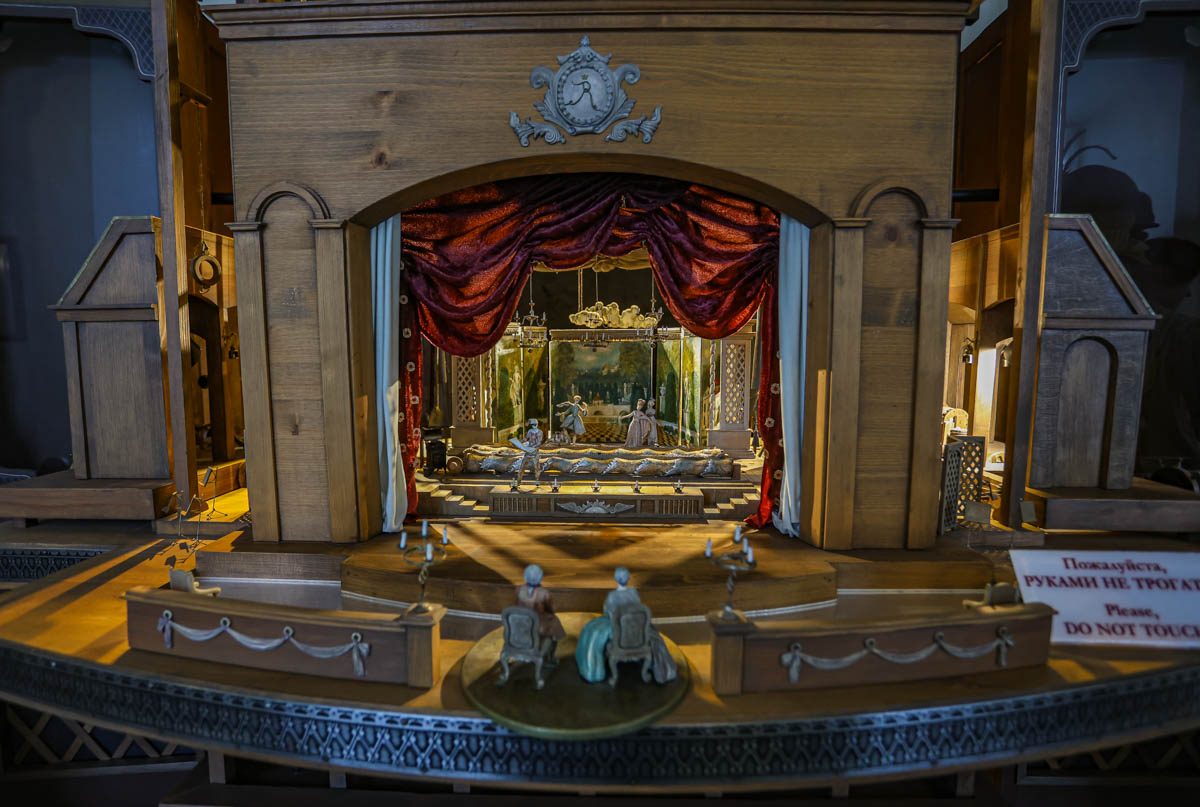 — Сцэну падчас пастановак упрыгожвалі не толькі дэкарацыі, якія малявалі прыдворныя мастакі, але і тэатральныя машыны, — працягвае экскурсавод, знаёмячы з экспазіцыяй перад Тэатральнай залай. — Вось макет адной з іх — "Хваля". Даўжыня арыгінала магла дасягаць 5 метраў. На падмосткі такія выкочвалі па некалькі штук. Работнік круціў ручку (нагадвае дэталь савецкай мясарубкі) і прыводзіў хвалі ў рух. А паміж імі «курсіравалі» марскія пачвары, караблі... Пагаворваюць, што спецыяльны прызначаны чалавек хадзіў паміж гледачамі і пырскаў ім у твары салёнай вадой. Вось такі 4D-эфект XVIII стагоддзя!
