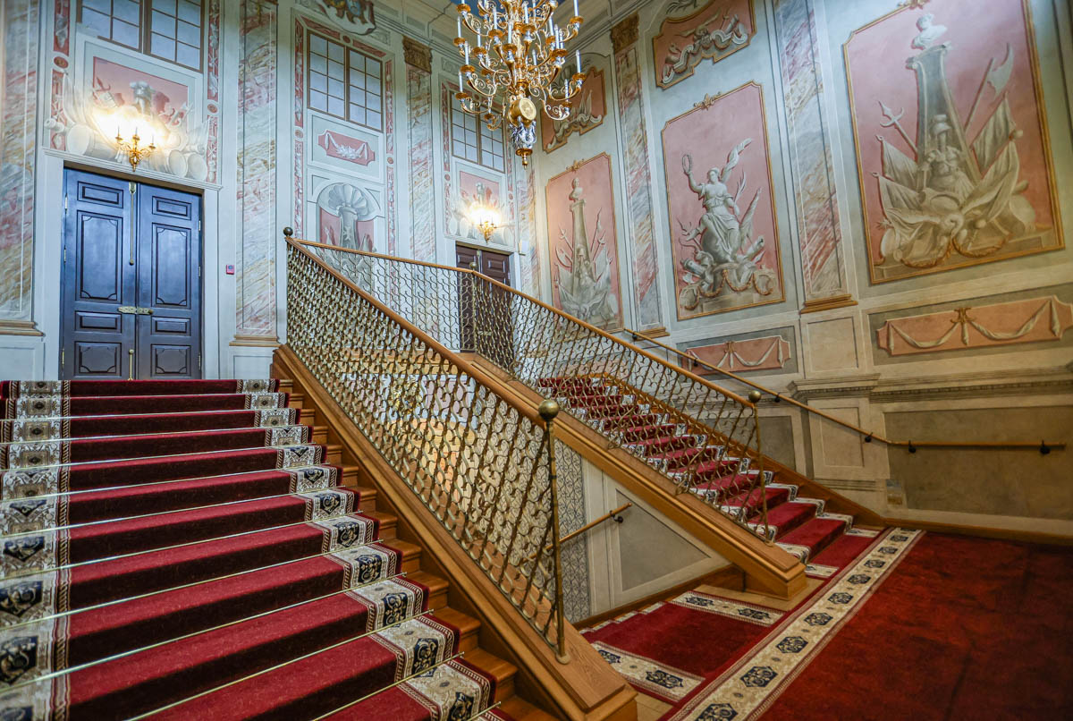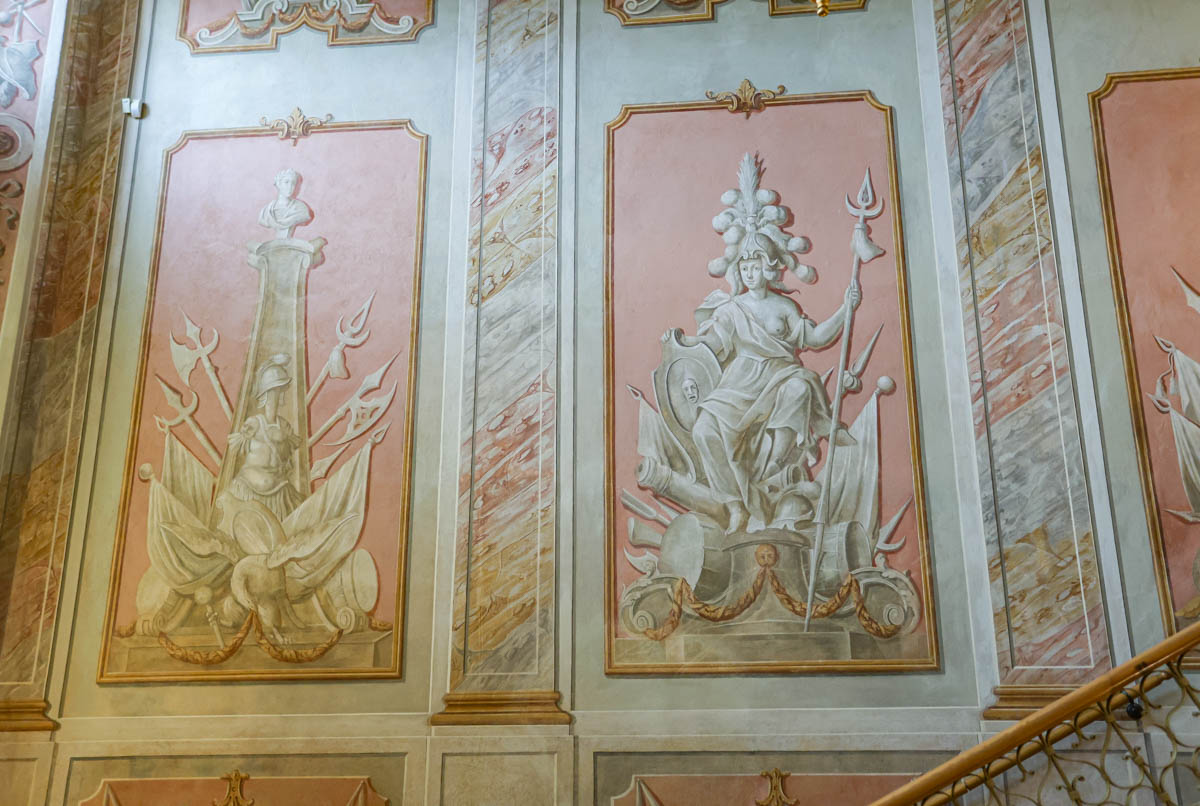 — Арыгінальныя фрэскі ў гэтай жа тэхніцы захаваліся таксама і на параднай лесвіцы, якая з'яўляецца сімвалічным цэнтрам і архітэктурнай воссю кампазіцыі ўсяго замкавага комплексу. У адрозненне ад фрэсак капліцы, яны ніколі не былі схаваныя, і толькі ў савецкі перыяд у іх быў унесены шэраг змен, — працягвае аповед Сяргей Чысцякоў. — Лесвіца ў замку існуе з XVI стагоддзя. Роспісы сцен і столі датуюцца другой паловай XVIII стагоддзя, выкананы ў стылі позняга барока. У іх прысутнічаюць — як арыенціры для натхнення на подзвігі — выявы трох багінь: Эас на палатне плафона, Афіна Палада і Ніка. У 1950-х на часткі фрэсак былі накладзены партрэты Кутузава, Суворава і Аляксандра Неўскага і выявы вышэйшых ваенных ордэнаў Узброеных Сіл СССР, заснаваных у іх гонар. Аўтарам роспісу быў мастак Натан Воранаў. У працэсе апошняй рэстаўрацыі выявы былі зменены на адноўленыя псеўдавокны.