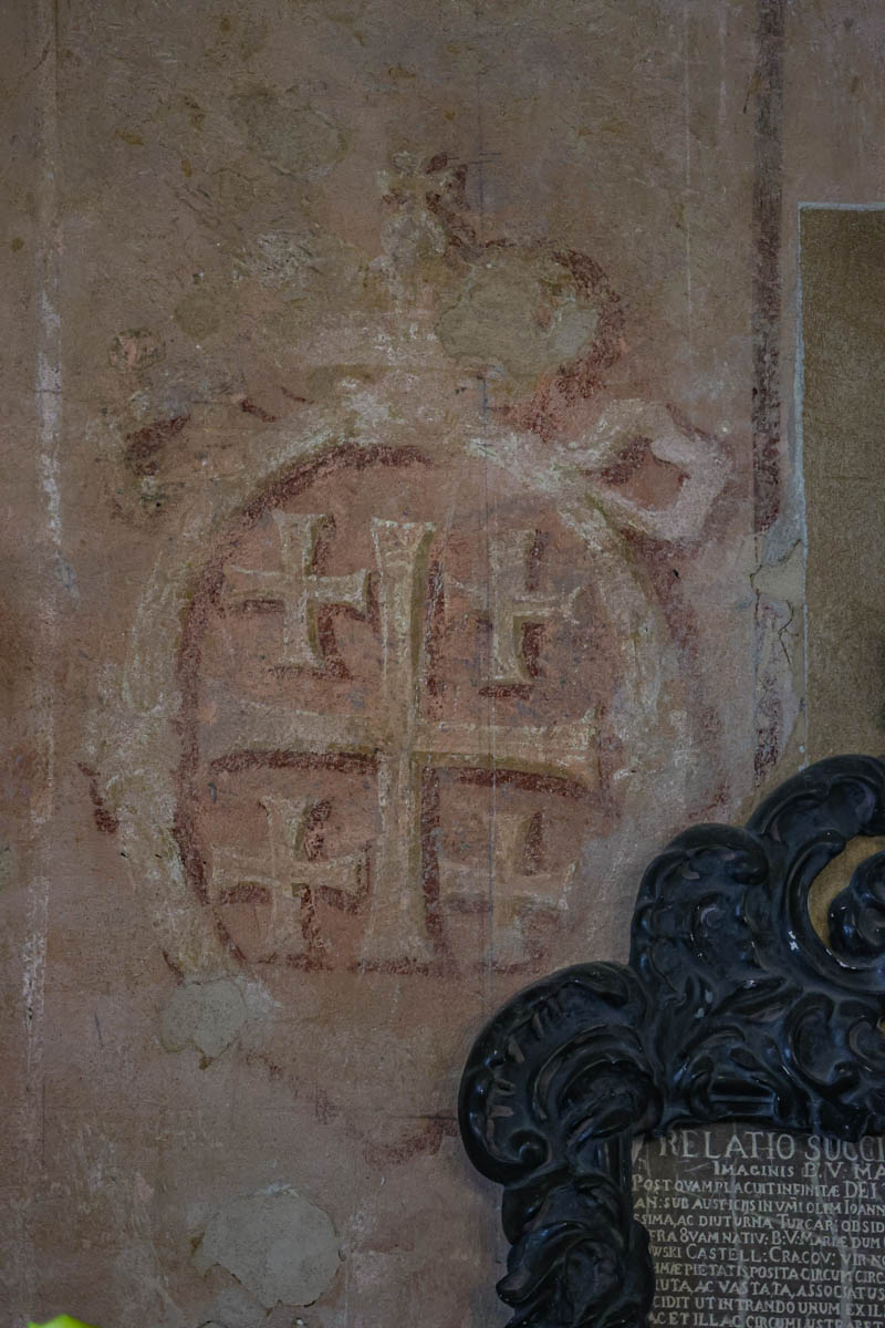 — У аснове арыгінальных фрэсак — выявы іерусалімскіх крыжоў, матывы якіх ляглі ў аснову роспісу ўсёй капліцы, — дапаўняе калегу малодшы навукавы супрацоўнік Кацярына Дзенісенка. — На адным з адхонаў рэстаўратары захавалі зандаж, які адкрывае пласты пакрыцця сцяны розных перыядаў часу, — для нас і нашых нашчадкаў.