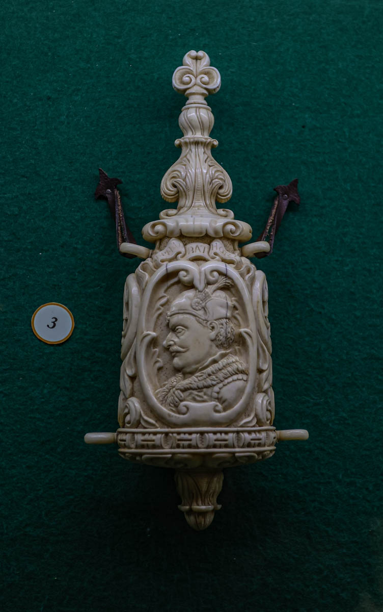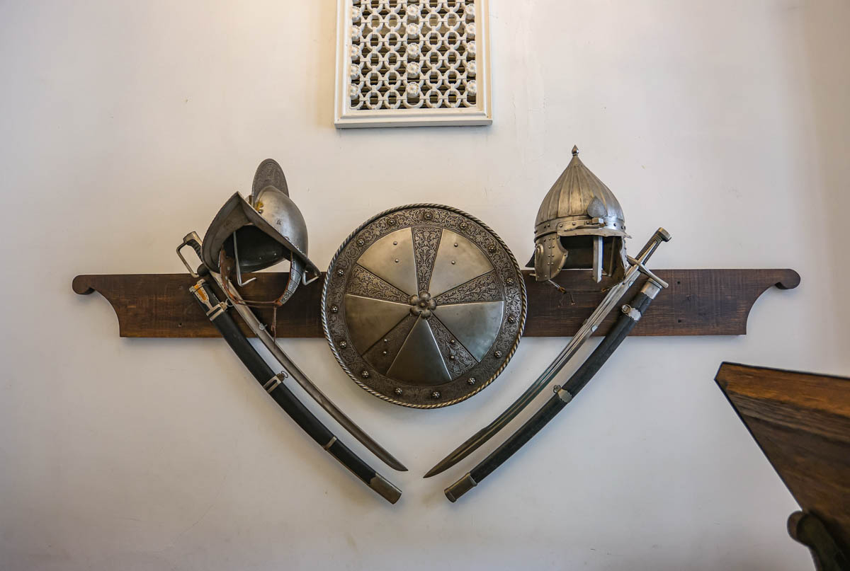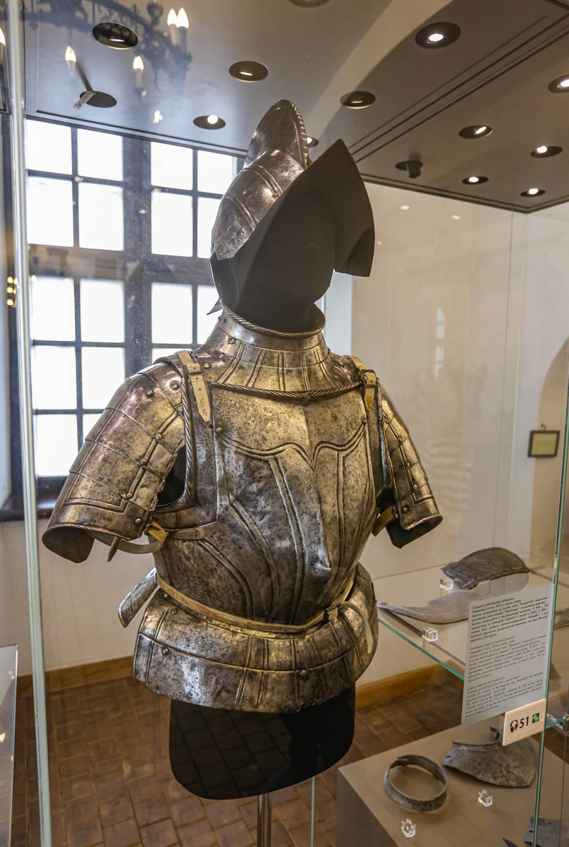 — У цэйхгаўзе таксама прыцягвае ўвагу аблегчаны арыгінальны паўдаспех з выступам на нагрудніку, які дазваляў дадаткова абараняць воіна ў блізкім баі. Выраблены ў другой палове XVІ стагоддзя ў Германіі, у тыя часы вісеў у Рыцарскай зале, якая знаходзілася на месцы цяперашней Залатой, — працягвае здзіўляць экскурсавод. — У 1926-м Радзівілы выставілі яго на аўкцыёне “Крысціс”. І даспех быў прададзены ў прыватную калекцыю ў Злучаныя Штаты Амерыкі. У 2016 годзе наш музей-запаведнік яго выкупіў і вярнуў у родныя пенаты.